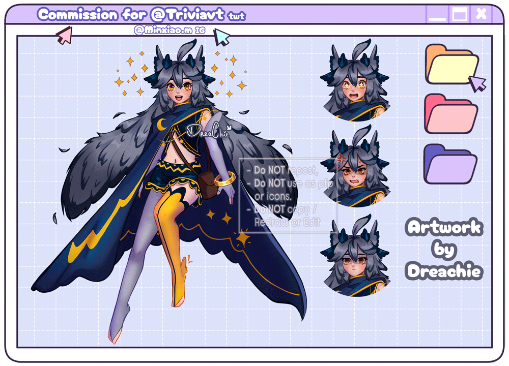 | Type of Use | The commissioner is allowed to use the artwork for personal use such as: Icon, wallaper, RP, non-profit medias. | Promotional work: Twitch (Overlays, profile picture, banner, PNG avatar, etc) Patreon, business cards. | Body Pillows, Book covers, merch, prints, Stickers, Pins, Key Chains, Acrylic Charms / Stands, Art Prints, postcards.. etc. |